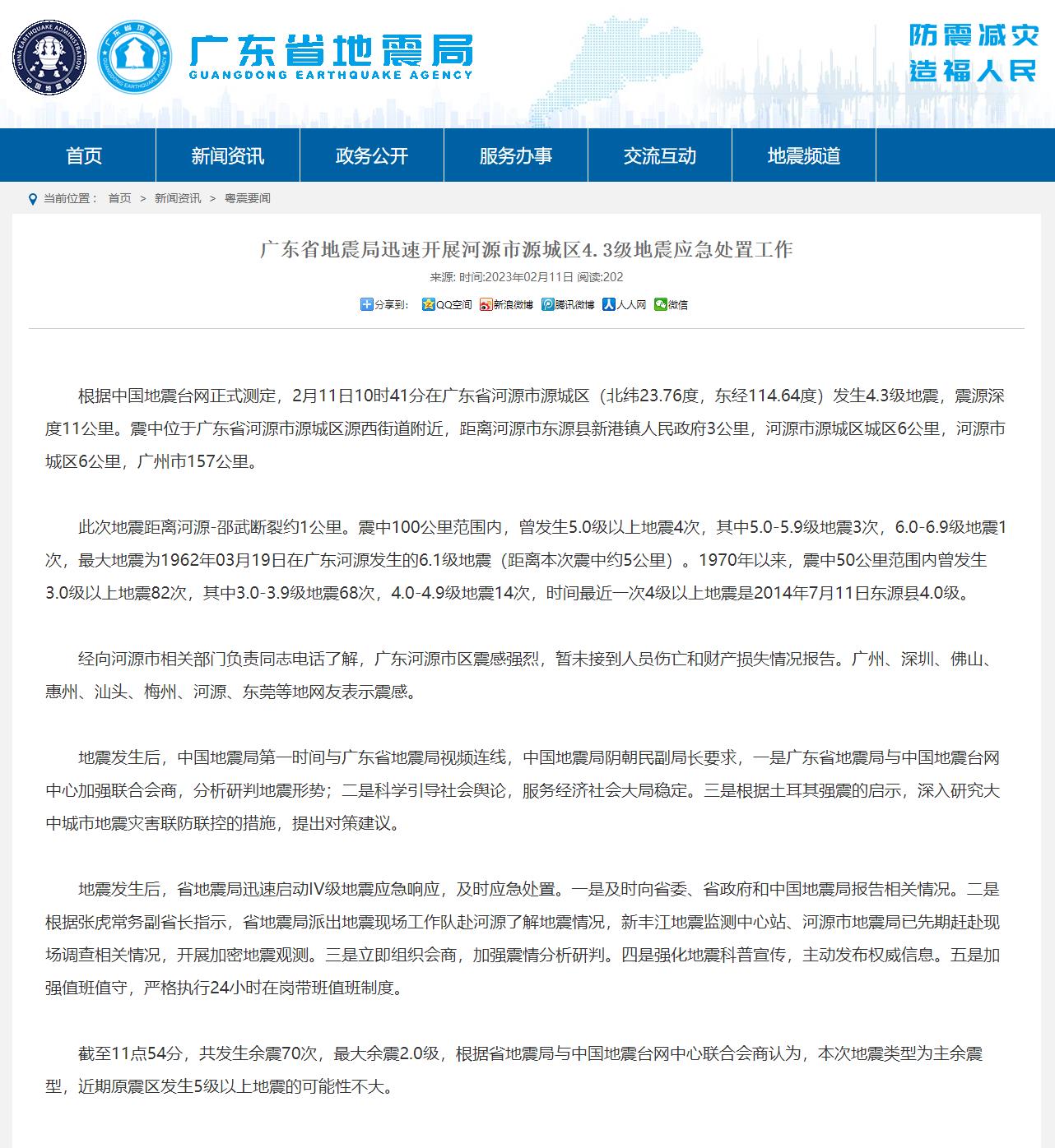 Seismological Bureau of Guangdong Province: As of 11: 54 on February 11th, there were 70 aftershocks after the 4.3 earthquake in Heyuan, Guangdong Province.