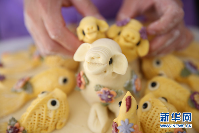 The tools for kneading dough are very simple. Sweater needles, combs, scissors and fruit knives are skillfully used. A dough is printed, rolled and pinched in your hand, and a naive pig is formed. Qiu Xia made three piglets with different shapes for this dough sculpture, and placed them in the center of the round lotus dough sculpture base, surrounded by nine small yellow goldfish. Pigs and fish are decorated with flower-shaped pieces made of colorful noodles, and a set of "pearls and jade" has been pinched in less than an hour.