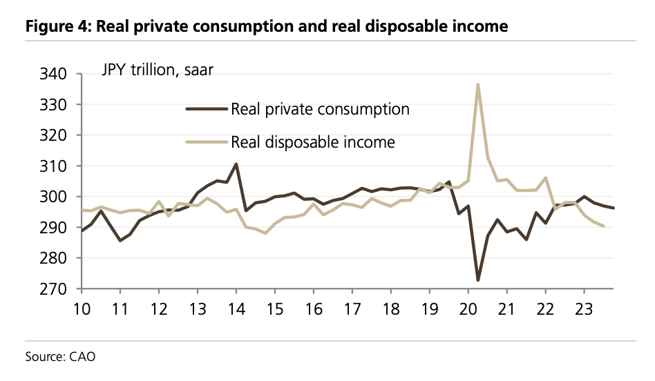 UBS pointed out that the weak consumption of Japanese residents has become an important reason for the technical recession, and it has always been a long-term concern of the government. In the fourth quarter, the consumption season of Japanese residents contracted by 0.9% year-on-year, which dragged down GDP by 0.5 percentage points, and it shrank for the third consecutive quarter. There are three factors: 1. The real wage income of residents continued to decline, 2. Enterprises did not increase capital expenditure as scheduled, and 3. Government public expenditure increased: